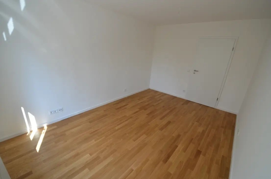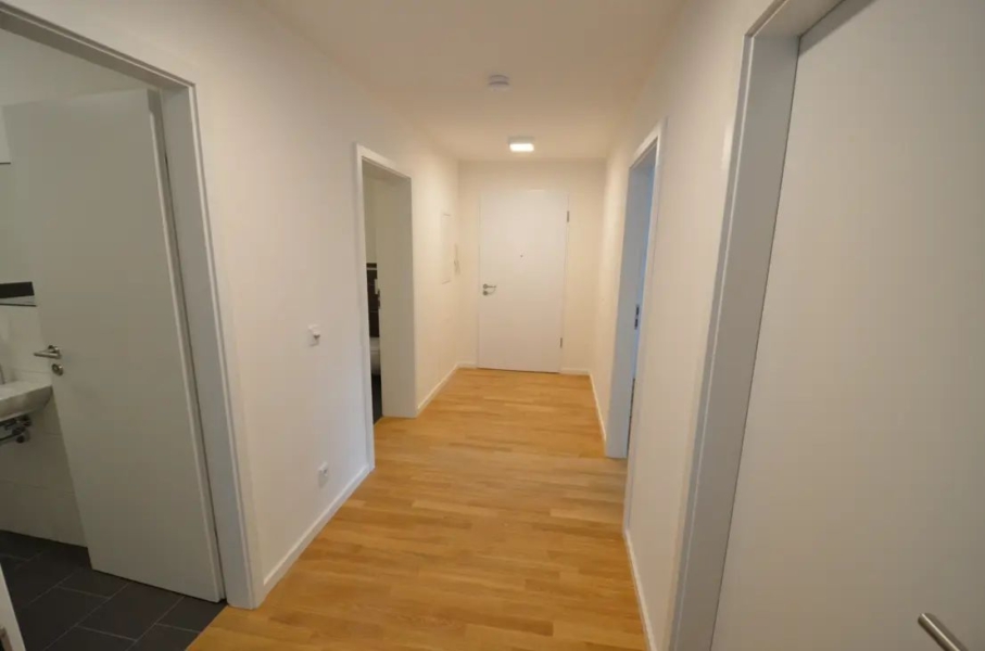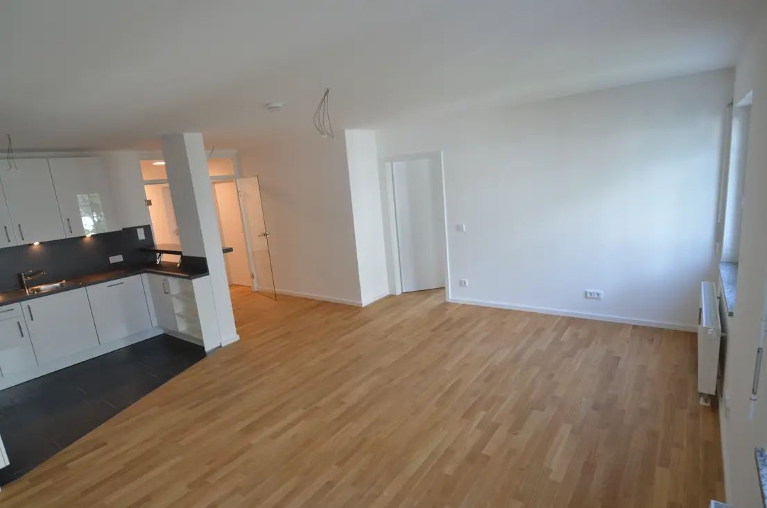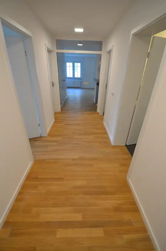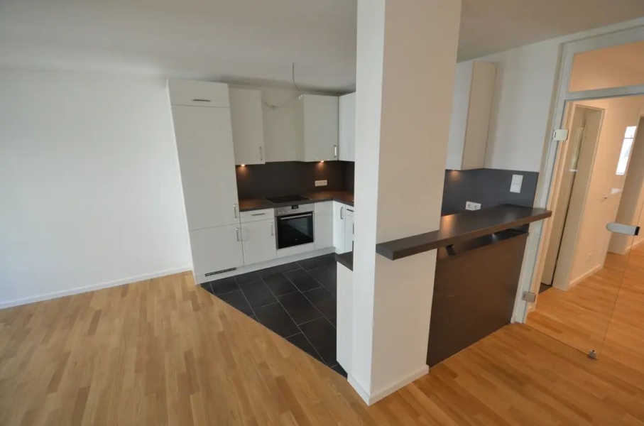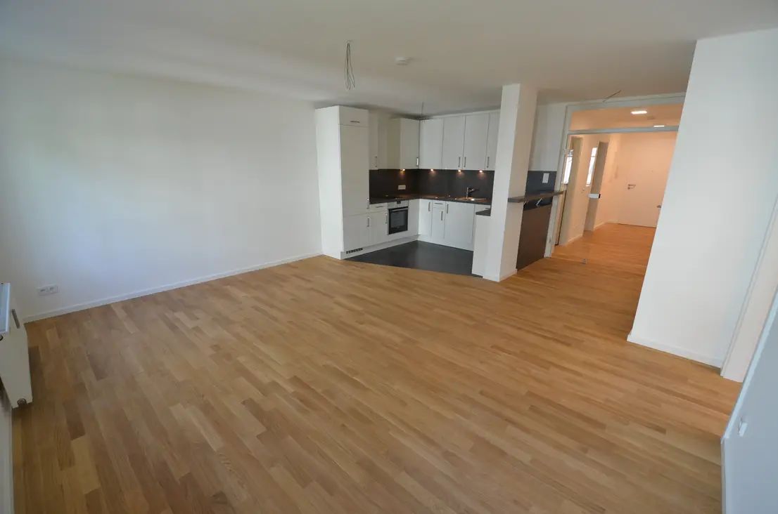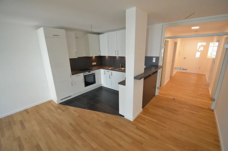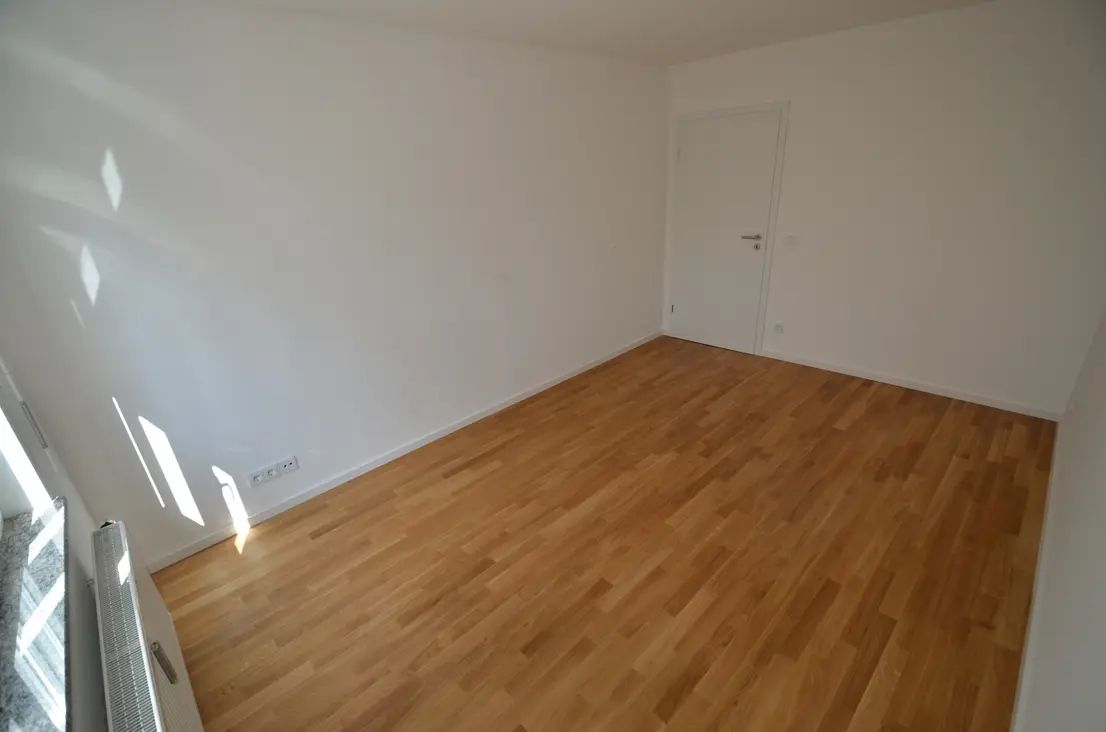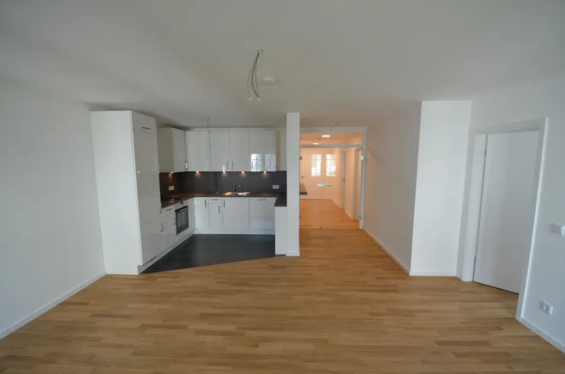 Im Wohnbereich wurde eine modern-offene Einbauküche mit Frühstückstresen integriert. Der Küchenbereich ist aufgrund der großformatigen, anthraziten Fließen optisch vom Wohnbereich abgesetzt, der mit hellem Eichenparkett ausgelegt ist. Auch alle übrigen Räumen (mit Ausnahme von Bad und Gäste WC) wurden mit hochwertigem, hellem Eichenparkettboden in ansprechender Sortierung versehen.