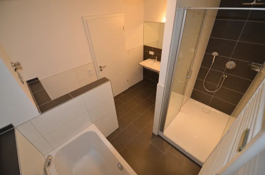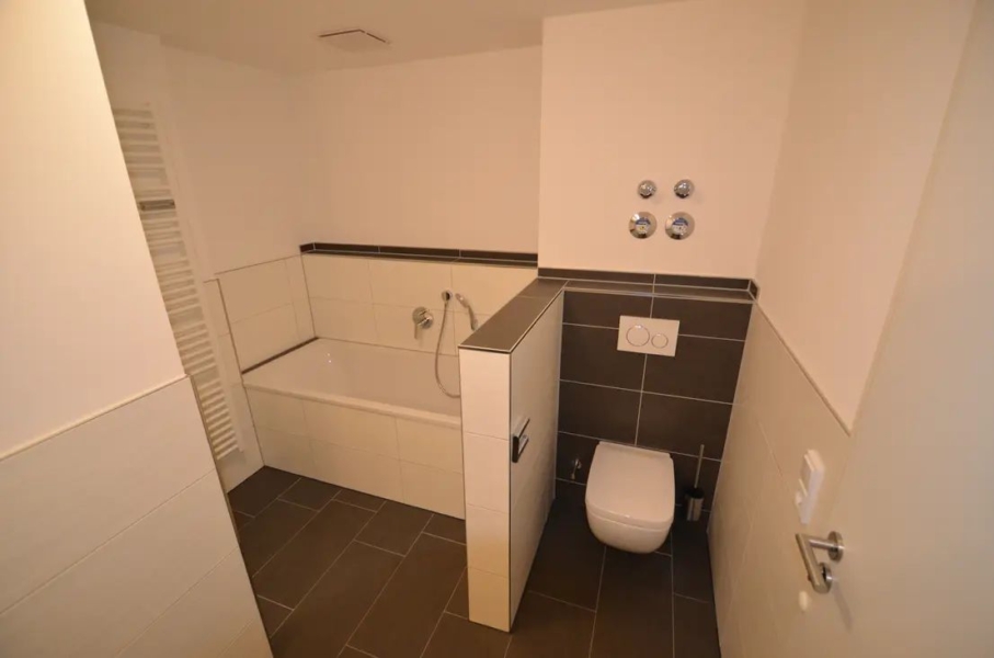 Das geräumige Bad verfügt über ein Doppelwaschbecken, eine modern-große Dusche mit Hand- und Regenbrause, eine Badewanne sowie ein WC. Das Bad ist mit Bad-Accessoires ausgestattet. Daneben gibt es hinreichend Platz für persönliche Badmöbel. Die großformatigen Bodenfliesen sind in modernem Anthrazit gehalten. Die Wände sind ebenso großformatig, jedoch weiß gefliest. Anthrazite Kontrastflächen an den Wänden runden das ansprechende Gesamtbild ab.