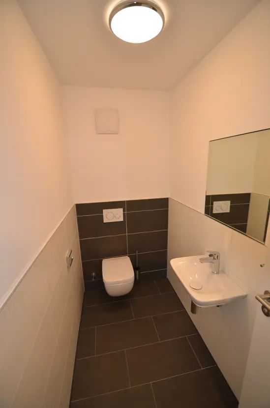 Das separate Gäste-WC ist im selben Stil wie das Bad gefließt und ausgestattet.